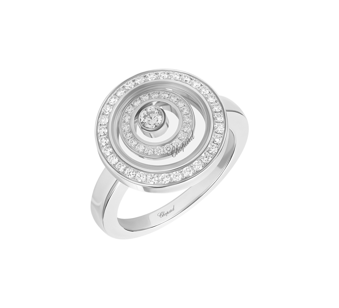 Кольцо Happy Spirit из белого золота с инкрустацией бриллиантами представляет собой две, вписанных друг в друга, окружности, в обрамлении которых кружится плавающий бриллиант. Его непрерывное движение – словно рассказ о бурной, радостной и кипучей жизни.