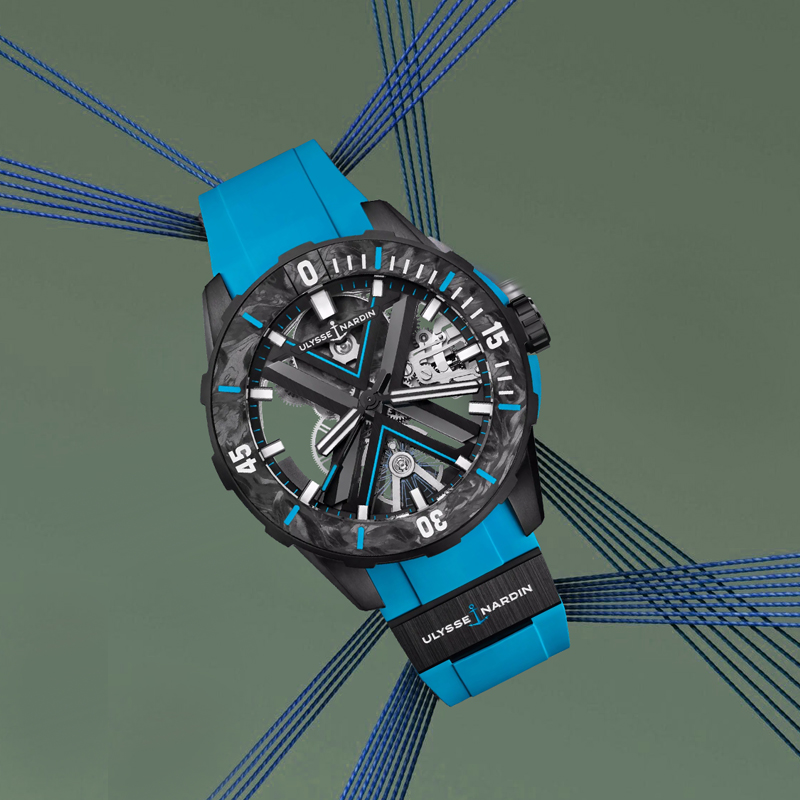 На фото: дайверы Ulysse Nardin в 44 мм корпусе из титана с черным DLC покрытием со скелетонизированным циферблатом